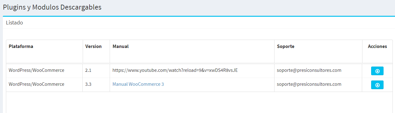 - Realizar las respectivas descargas de archivo (desde la columna “Acciones”) y manuales (desde la columna “Manual”).