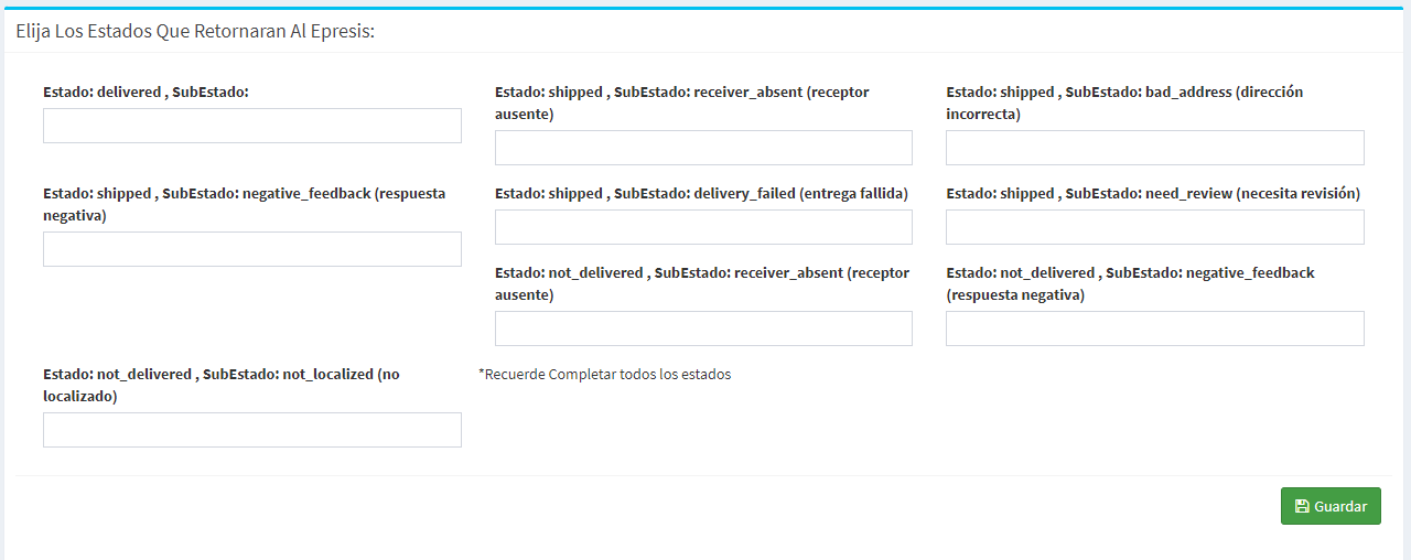 Los mismos, se configuran en el Menú Principal/ Mercadolibre Flex/ Configuración General. Allí podremos asociar los estados de Mercado Libre con estados del Epresis,  siendo éstos todos los posibles estados que podría adoptar el paquete una vez llegado a la sucursal.