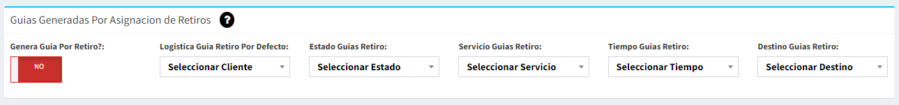 Colocar el botón “Genera Guía Por Retiro?” en SI, y seleccionar a su vez: Logística, Estado y Servicio (que buscará por defecto el sistema, cuando se asigne un retiro y se cree la guía automáticamente).
